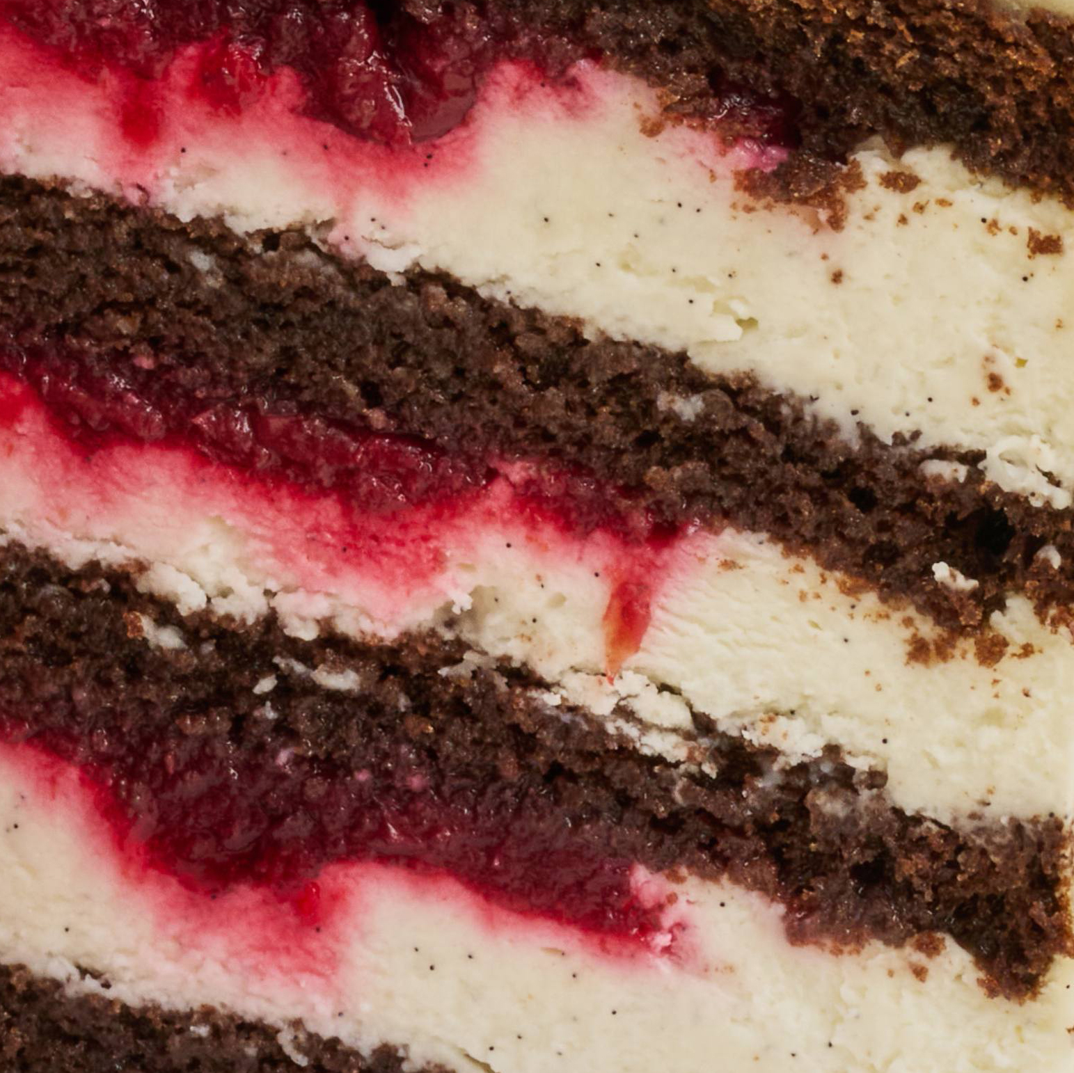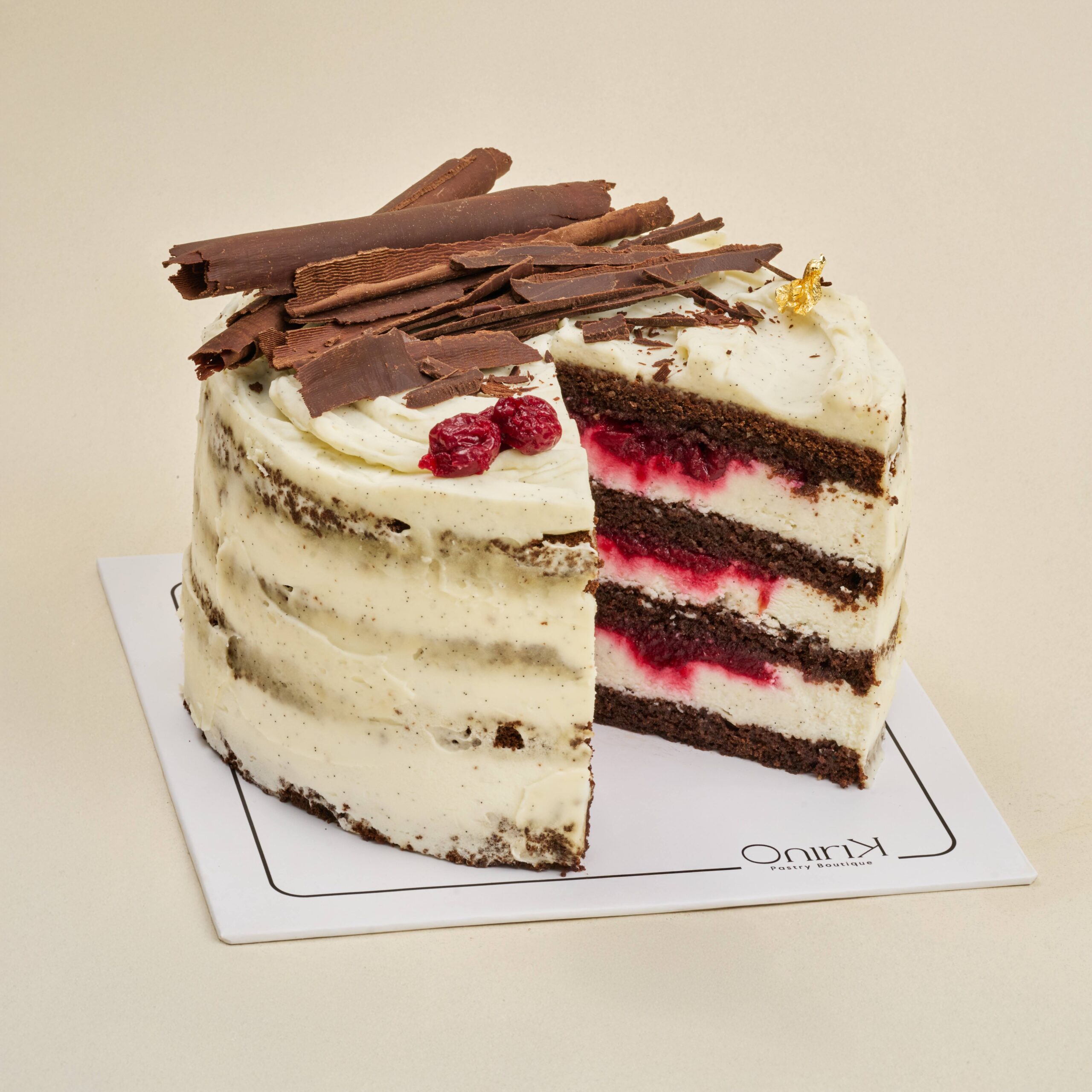 Soft chocolate layers unfold into a light vanilla chantilly and a bright cherry compote.