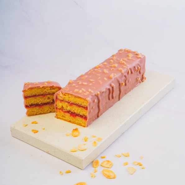 Gâteau à la Vanille Ruby is a delicate creation, featuring moist vanilla financier layered with raspberry compote and covered in luscious ruby chocolate, intertwining sweet fruit notes with flavorful cream.