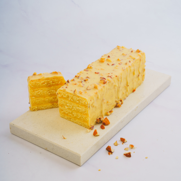 This is a vibrant treat featuring zesty lemon pound cake layered with a creamy yet tangy lemon ganache, and coated with a smooth layer of yellow chocolate. Discover notes of citrus and cream like never before.