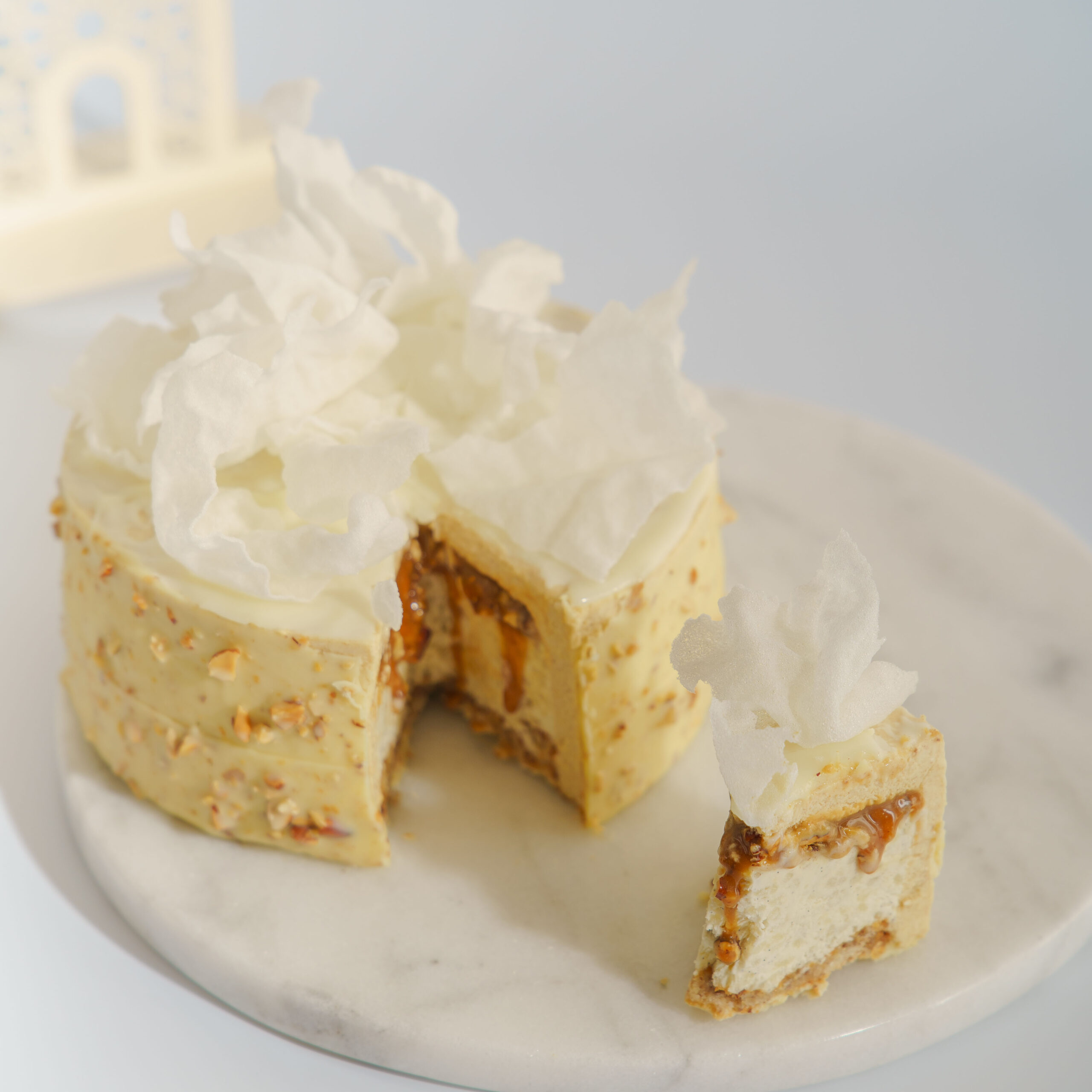 A harmonious blend of roasted pecans, creamy vanilla rice pudding layers, rich caramel, and sweet dates — crafted to evoke the warmth of Ramadan gatherings.