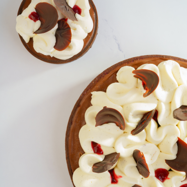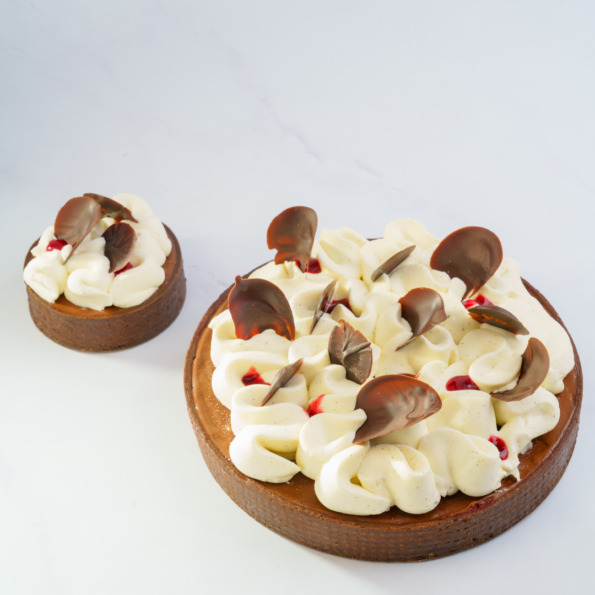 This tart is a decadent twist on a classic, featuring a chocolate tart base filled with chocolate financier, layered with sour cherry compote and rich chocolate ganache. It’s finished with a generous swirl of vanilla Chantilly cream for a perfect balance of bold, fruity, and creamy flavors. A classic like you’ve never experienced before!